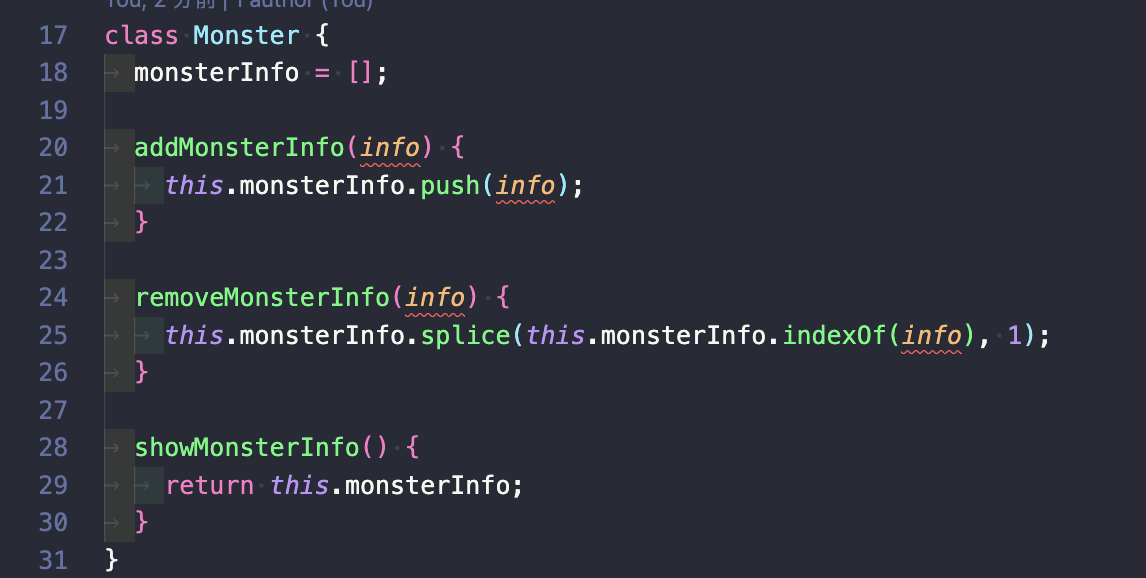 class Monster { monsterInfo = []; addMonsterInfo(info) { this.monsterInfo.push(info); } removeMonsterInfo(info) { this.monsterInfo.splice(this.monsterInfo.indexOf(info), 1); } showMonsterInfo() { return this.monsterInfo; } }