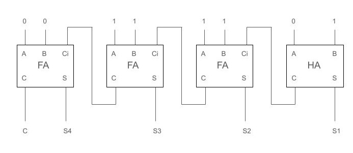 最下位bitは桁上がりを考慮する必要がないため、HAを使用し、それ以外は桁上がりを考慮するFAを組み合わせています。