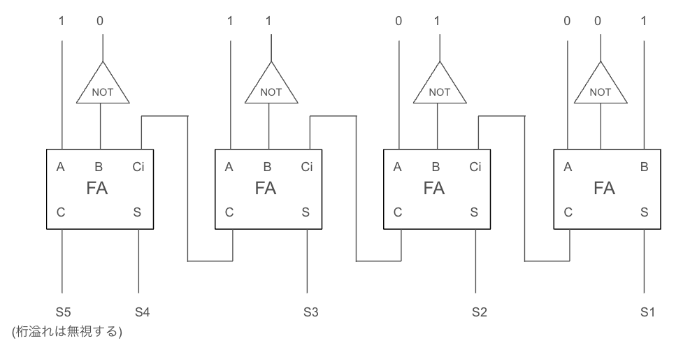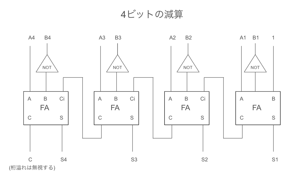 減算回路では、1を足すためにHAを使用せず、FAのみを使用し、最下位bitの桁上がり部分に1を入力します。
