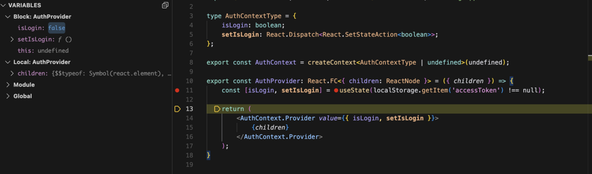 一度AuthProviderで処理が止まりますが、処理をすすめると、ログイン処理を行うコンポーネントで止まるはずです