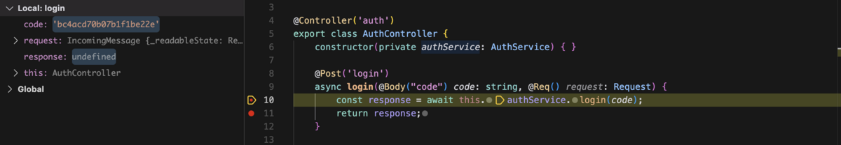 const response = await this.authService.login(code);の処理が見たいのでステップ・インします