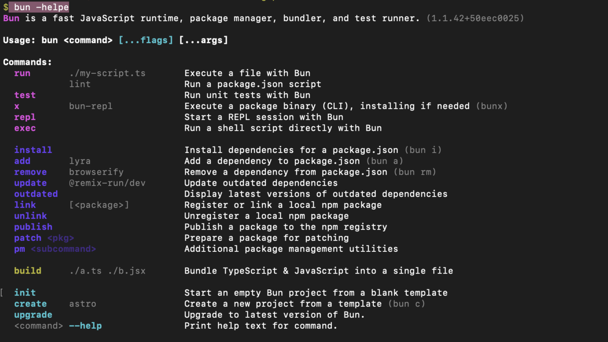 | bun init | 新しいプロジェクトを素早くセットアップするコマンドです。 |