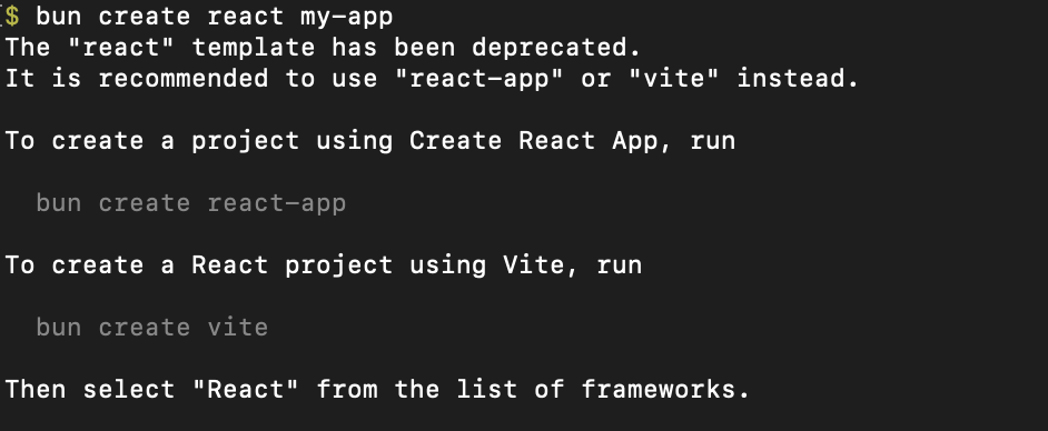 このコマンドbun create react my-appで実行しましたが、非推奨と出てしまいました😭